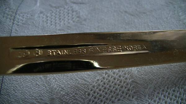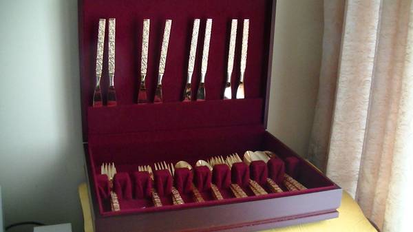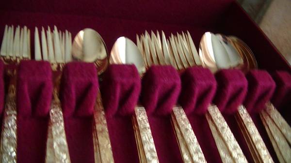 New, never-used gold-plated stainless spoons, forks, and knives set for 8 people, with the box.