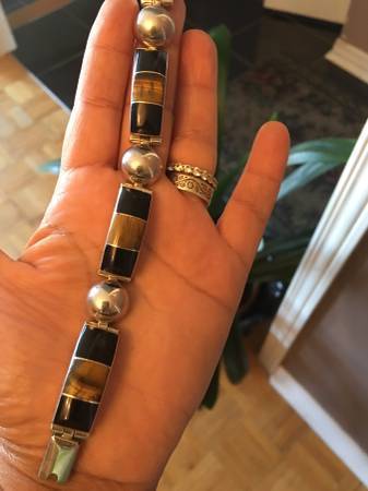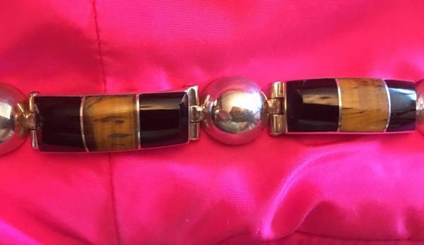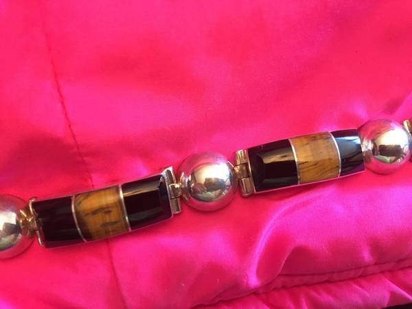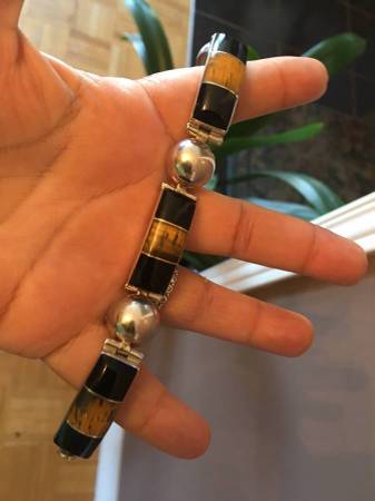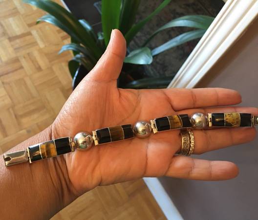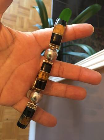 Solid Sterling Silver Bracelet with Onyx and Tiger Eyes Stones Excellent Condition and Beautiful Design Really Special Design and have a bit of weight on it Very Safe Lock if interested please call...