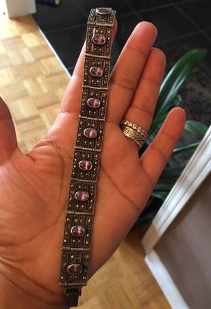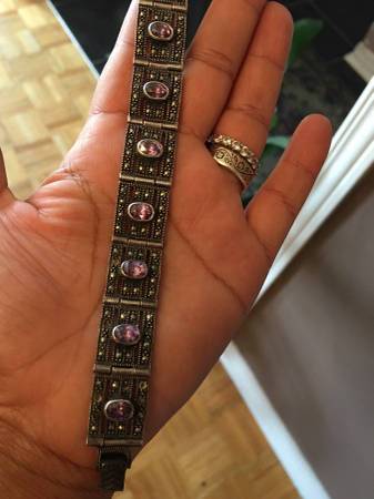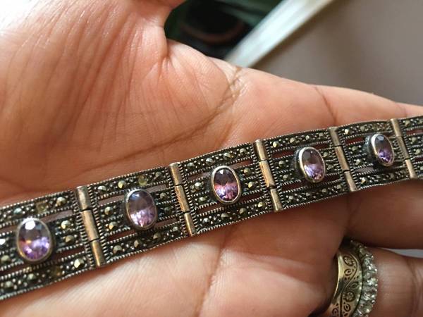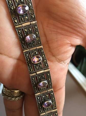 Sterling Silver Bracelet with Natural Amethyst Stones And Marcasite Design Excellent Condition and a bit of weight on it Really Beautiful with clear silver Stamp there if interested please call or...