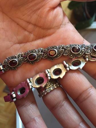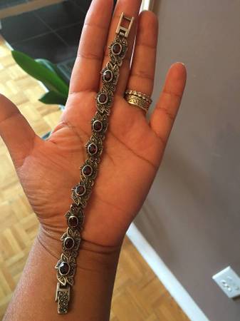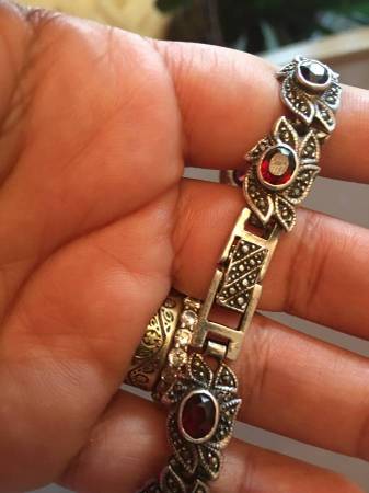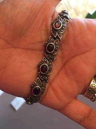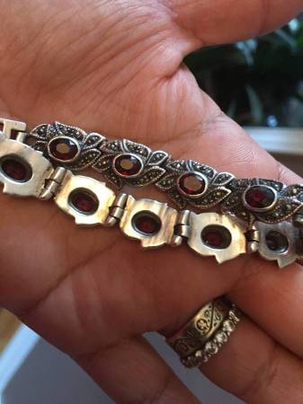Sterling Silver Bracelet with Garnet Stones and Marcasite Details Simply Stunning Bracelet Very Clear Sterling Silver stamp with Excellent Condition And Beautiful Style. Such unique Design and high...