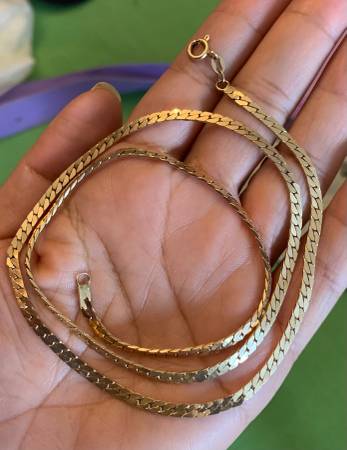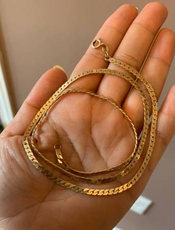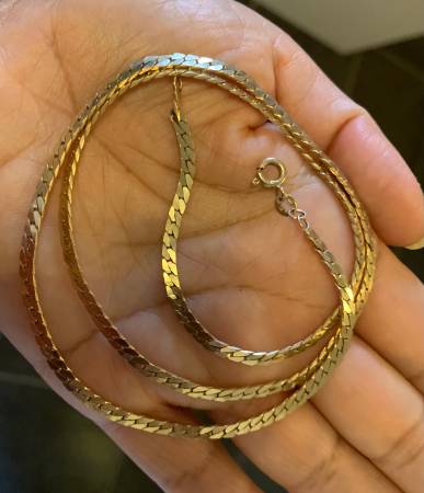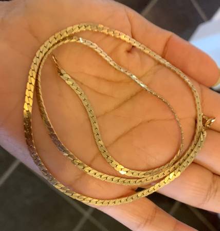 21 inches Yellow Gold Herringbone Necklace with Decent Thickness Very Elegant Design and Excellent Condition Beautiful Design and decent weight if you are interested please call or send an email