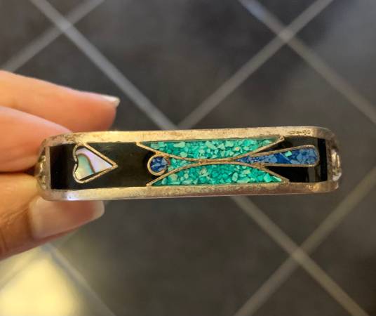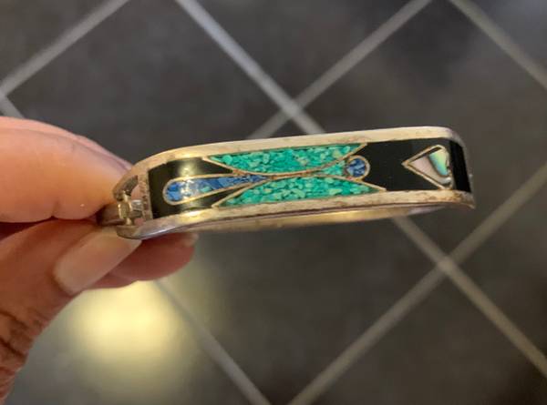 Sterling Silver Bangle Mother of Pearl opens from the Side (from Mexico) Small size Excellent Condition and a safe Lock if interested please call or send an email