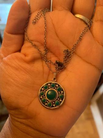 Vintage Sterling Silver Necklace with Elegant Pendant have Natural Green Stones Excellent Condition and clear Sterling Silver Stamp everywhere with cute Design Vintage Lovers if interested please...