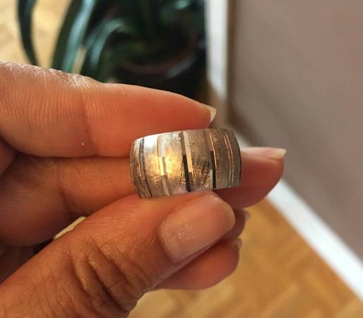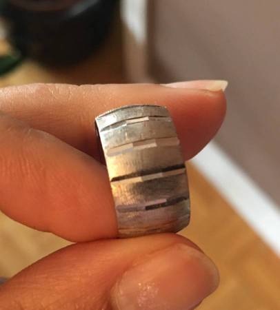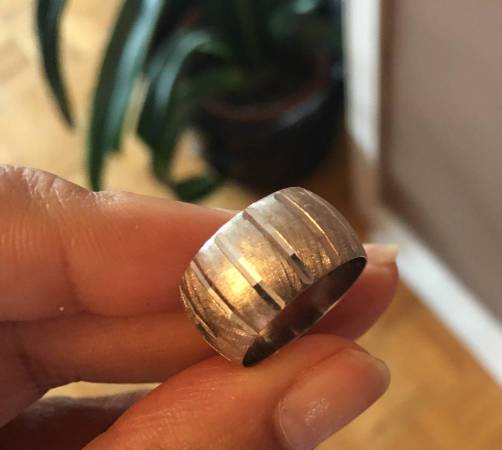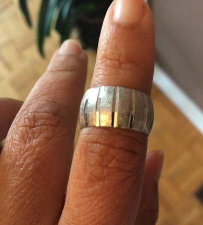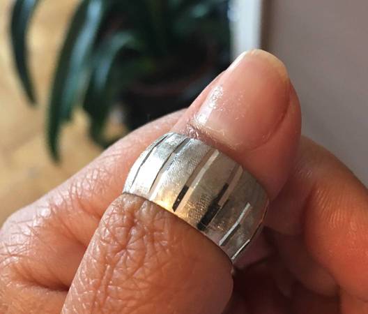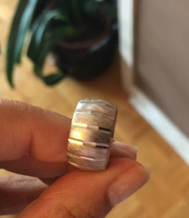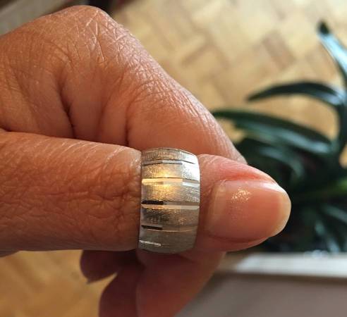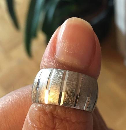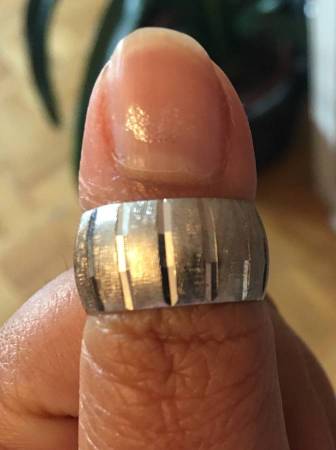 Wide and Solid white Gold Band with shining Design (Size 4-5) Please note: Design is all around the Band Excellent Condition and absolutely elegant if interested please call or send an email