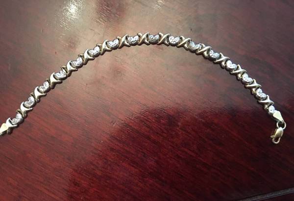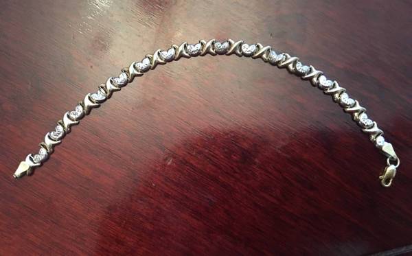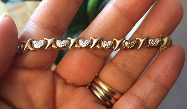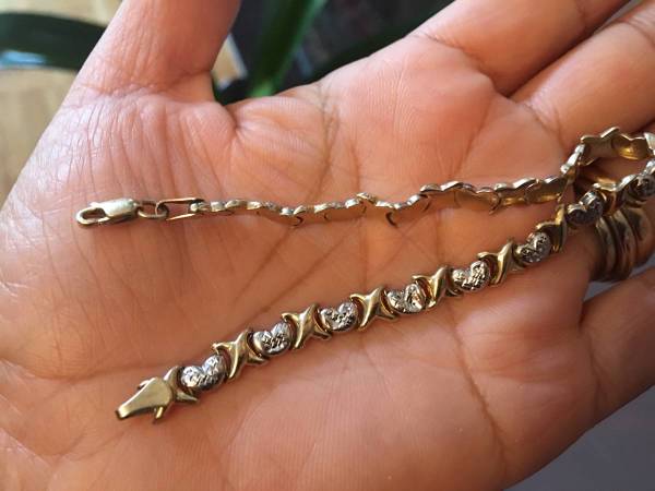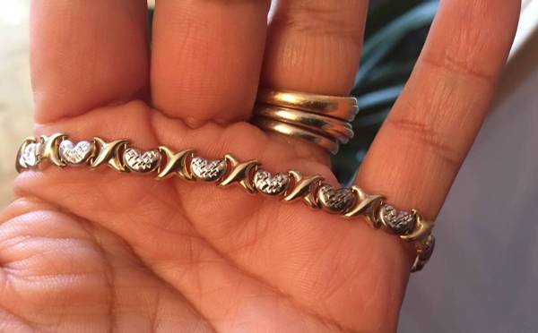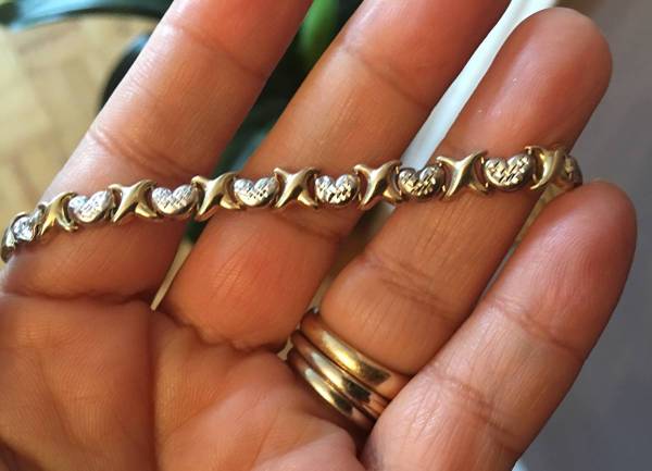 Yellow and White Italian Gold Bracelet With Hearts Design Excellent Condition and clear Gold Stamp st Beautiful and Romantic Deso if interested please call or send an email