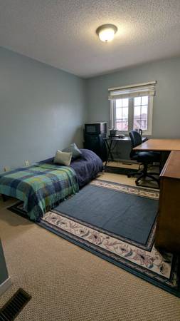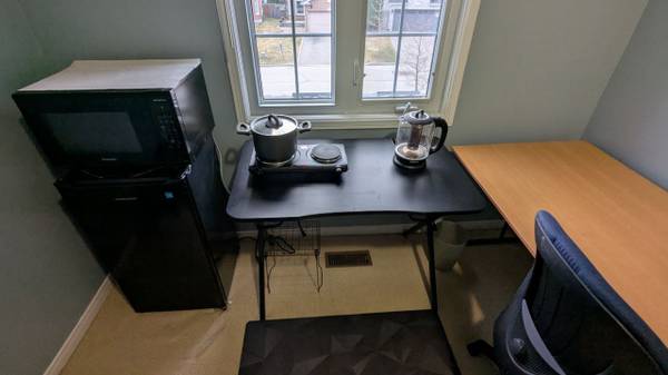 This big, bright room has a big closet. It includes a refrigerator, microwave, double hot plate stove, rug, bed frame, mattress, bedding, desk, and chair. The room is situated in a quiet, clean house in a well-established, high-end neighborhood in Richmond Hill, close to parks, shopping, and transportation.