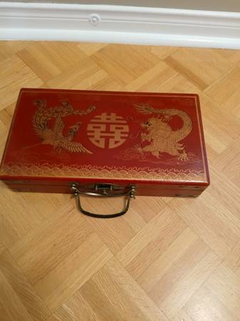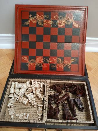 I have a Vintage Asian / Chinese Style Cast Chess Set in Finished Wood Box in good to very good condition I believe the board is a leather or leather type material